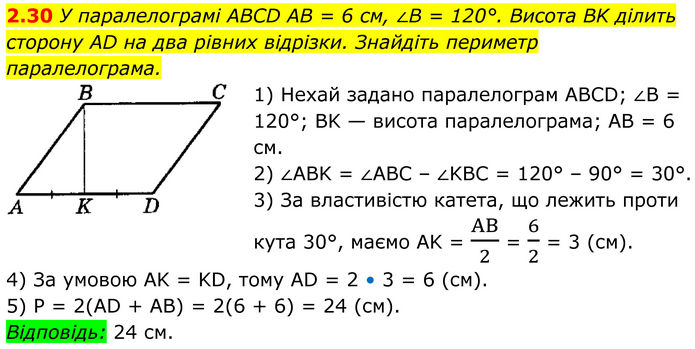 У паралелограмі ABCD AB = 6 см, ∠B = 120°. Висота BK ділить сторону AD на два рівних відрізки. Знайдіть периметр паралелограма. 1) Нехай задано паралелограм ABCD; ∠B = 120°; BK — висота паралелограма; AB = 6 см. 2) ∠ABK = ∠ABC – ∠KBC = 120° – 90° = 30°. 3) За властивістю катета, що лежить проти кута 30°, маємо AK = AB/2 = 6/2 = 3 (см). 4) За умовою AK = KD, тому AD = 2 • 3 = 6 (см). 5) P = 2(AD + AB) = 2(6 + 6) = 24 (см). Відповідь: 24 см.