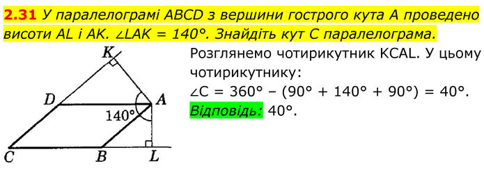 У паралелограмі ABCD з вершини гострого кута A проведено висоти AL і AK. ∠LAK = 140°. Знайдіть кут C паралелограма. Розглянемо чотирикутник KCAL. У цьому чотирикутнику: ∠C = 360° – (90° + 140° + 90°) = 40°. Відповідь: 40°.