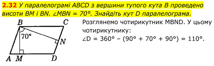 У паралелограмі ABCD з вершини тупого кута B проведено висоти BM і BN. ∠MBN = 70°. Знайдіть кут D паралелограма. Розглянемо чотирикутник MBND. У цьому чотирикутнику: ∠D = 360° – (90° + 70° + 90°) = 110°.