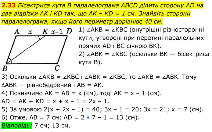 Бісектриса кута B паралелограма ABCD ділить сторону AD на два відрізки AK і KD так, що AK – KD = 1 см. Знайдіть сторони паралелограма, якщо його периметр дорівнює 40 см. 1) ∠AKB = ∠KBC (внутрішні різносторонні кути, утворені при перетині паралельних прямих AD і BC січною BK). 2) ∠ABK = ∠KBC (оскільки BK — бісектриса кута В). 3) Оскільки ∠AKB = ∠KBC і ∠ABK = ∠KBC, то ∠AKB = ∠ABK. Тому ∆ABK — рівнобедрений і AB = AK. 4) Позначимо AK = AB = х (см), тоді AK = х – 1 (см). AD = AK + KD = х + х – 1 = 2х – 1. 5) За умовою 2(х + 2х – 1) = 40; Зх – 1 = 20; Зх = 21; х = 7 (см). 6) Отже, AB = 7 см; AD = 2 • 7 – 1 = 13 (см). Відповідь: 7 см; 13 см.