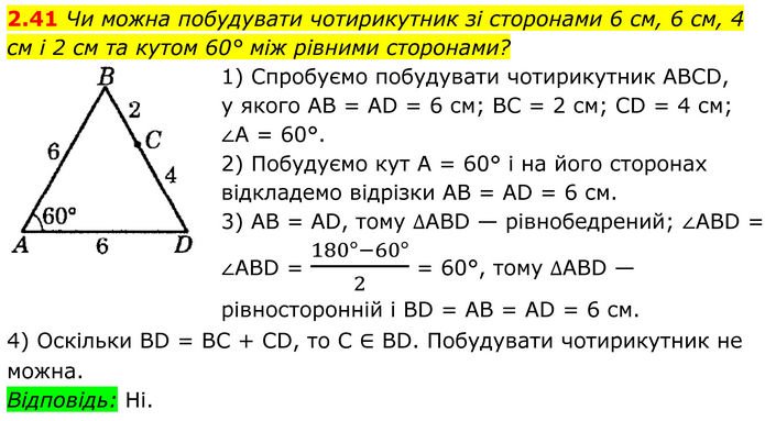Чи можна побудувати чотирикутник зі сторонами 6 см, 6 см, 4 см і 2 см та кутом 60° між рівними сторонами? 1) Спробуємо побудувати чотирикутник ABCD, у якого AB = AD = 6 см; BC = 2 см; CD = 4 см; ∠A = 60°. 2) Побудуємо кут А = 60° і на його сторонах відкладемо відрізки AB = AD = 6 см. 3) AB = AD, тому ∆ABD — рівнобедрений; ∠ABD = ∠ABD = (180°-60°)/2 = 60°, тому ∆ABD — рівносторонній і BD = AB = AD = 6 см. 4) Оскільки BD = BC + CD, то C ∈ BD. Побудувати чотирикутник не можна. Відповідь: Ні.
