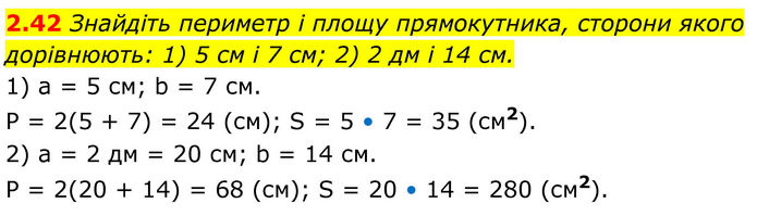 Знайдіть периметр і площу прямокутника, сторони якого дорівнюють: 1) 5 см і 7 см; 2) 2 дм і 14 см. 1) а = 5 см; b = 7 см. P = 2(5 + 7) = 24 (см); S = 5 • 7 = 35 (см2). 2) а = 2 дм = 20 см; b = 14 см. P = 2(20 + 14) = 68 (см); S = 20 • 14 = 280 (см2).