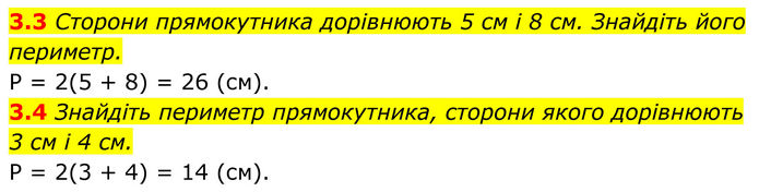 3.3 Сторони прямокутника дорівнюють 5 см і 8 см. Знайдіть його периметр. P = 2(5 + 8) = 26 (см). 3.4 Знайдіть периметр прямокутника, сторони якого дорівнюють 3 см і 4 см. P = 2(3 + 4) = 14 (см).