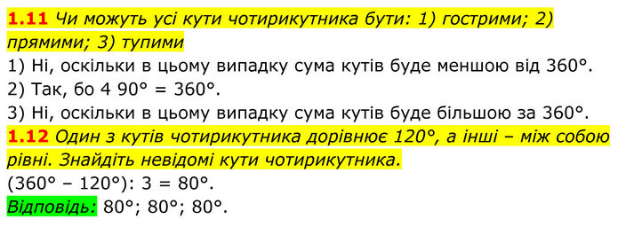 1.11 Чи можуть усі кути чотирикутника бути: 1) гострими; 2) прямими; 3) тупими 1) Ні, оскільки в цьому випадку сума кутів буде меншою від 360°. 2) Так, бо 4 90° = 360°. 3) Ні, оскільки в цьому випадку сума кутів буде більшою за 360°. 1.12 Один з кутів чотирикутника дорівнює 120°, а інші – між собою рівні. Знайдіть невідомі кути чотирикутника. (360° – 120°): 3 = 80°. Відповідь: 80°; 80°; 80°.