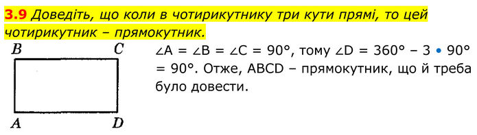 Доведіть, що коли в чотирикутнику три кути прямі, то цей чотирикутник – прямокутник. ∠А = ∠В = ∠С = 90°, тому ∠D = 360° – 3 • 90° = 90°. Отже, ABCD – прямокутник, що й треба було довести.