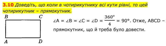 Доведіть, що коли в чотирикутнику всі кути рівні, то цей чотирикутник – прямокутник. ∠A = ∠B = ∠C = ∠D = (360°)/4 = 90°. Отже, ABCD – прямокутник, що й треба було довести.