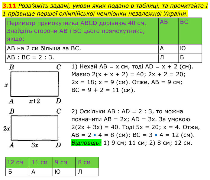 Розв’яжіть задачі, умови яких подано в таблиці, та прочитайте І 1 прізвище першої олімпійської чемпіонки незалежної України. 1) Нехай AB = х см, тоді AD = х + 2 (см). Маємо 2(х + х + 2) = 40; 2х + 2 = 20; 2х = 18; х = 9 (см). Отже, AB = 9 см; ВС = 9 + 2 = 11 (см). 2) Оскільки AB : AD = 2 : 3, то можна позначити AB = 2х; AD = Зх. За умовою 2(2х + Зх) = 40. Тоді 5х = 20; х = 4. Отже, AB = 2 • 4 = 8 (см); ВС = 3 • 4 = 12 (см). Відповідь: 1) 9 см; 11 см; 2) 8 см; 12 см.