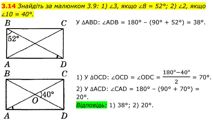 Знайдіть за малюнком 3.9: 1) ∠3, якщо ∠8 = 52°; 2) ∠2, якщо ∠10 = 40°. У ∆ABD: ∠ADB = 180° – (90° + 52°) = 38°. 1) У ∆OCD: ∠OCD = ∠ODC = (180°-40°)/2 = 70°. 2) У ∆ACD: ∠CAD = 180° – (90° + 70°) = 20°. Відповідь: 1) 38°; 2) 20°.