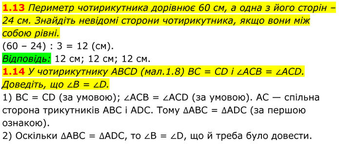 1.13 Периметр чотирикутника дорівнює 60 см, а одна з його сторін – 24 см. Знайдіть невідомі сторони чотирикутника, якщо вони між собою рівні. (60 – 24) : 3 = 12 (см). Відповідь: 12 см; 12 см; 12 см. 1.14 У чотирикутнику ABCD (мал.1.8) BC = CD і ∠ACB = ∠ACD. Доведіть, що ∠B = ∠D. 1) BC = CD (за умовою); ∠ACB = ∠ACD (за умовою). AC — спільна сторона трикутників ABC і ADC. Тому ∆ABC = ∆ADC (за першою ознакою). 2) Оскільки ∆ABC = ∆ADC, то ∠B = ∠D, що й треба було довести.