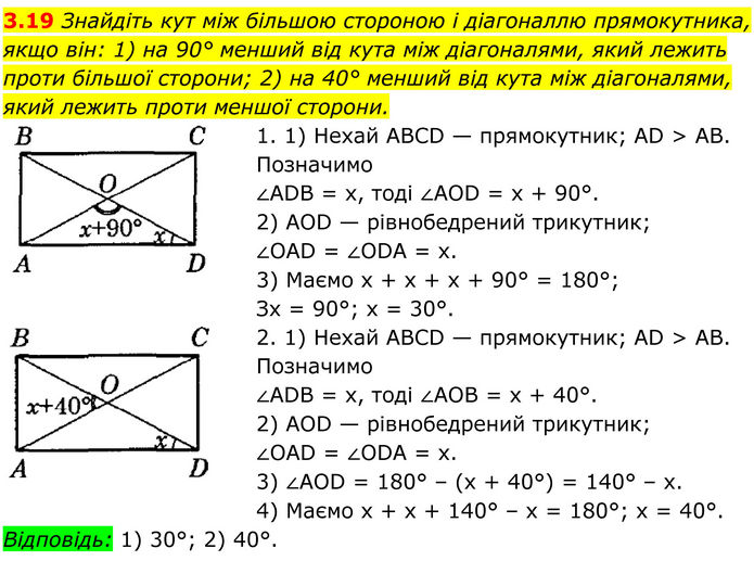 Знайдіть кут між більшою стороною і діагоналлю прямокутника, якщо він: 1) на 90° менший від кута між діагоналями, який лежить проти більшої сторони; 2) на 40° менший від кута між діагоналями, який лежить проти меншої сторони. 1. 1) Нехай ABCD — прямокутник; AD > AB. Позначимо ∠ADB = х, тоді ∠AOD = х + 90°. 2) AOD — рівнобедрений трикутник; ∠OAD = ∠ODA = х. 3) Маємо х + х + х + 90° = 180°; Зх = 90°; х = 30°. 2. 1) Нехай ABCD — прямокутник; AD > AB. Позначимо ∠ADB = х, тоді ∠AOB = х + 40°. 2) AOD — рівнобедрений трикутник; ∠OAD = ∠ODA = х. 3) ∠AOD = 180° – (х + 40°) = 140° – х. 4) Маємо х + х + 140° – х = 180°; х = 40°. Відповідь: 1) 30°; 2) 40°.