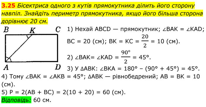 Бісектриса одного з кутів прямокутника ділить його сторону навпіл. Знайдіть периметр прямокутника, якщо його більша сторона дорівнює 20 см. 1) Нехай ABCD — прямокутник; ∠BAK = ∠KAD; BC = 20 (см); BK = KC = 20/2 = 10 (см). 2) ∠BAK= ∠KAD = (90°)/2 = 45°. 3) У ∆АВК: ∠BKA = 180° – (90° + 45°) = 45°. 4) Tому ∠BAK = ∠AKB = 45°; ∆ABK — рівнобедрений; AB = BK = 10 (см). 5) P = 2(AB + ВС) = 2(10 + 20) = 60 (см). Відповідь: 60 см.