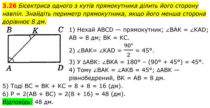 Бісектриса одного з кутів прямокутника ділить його сторону навпіл. Знайдіть периметр прямокутника, якщо його менша сторона дорівнює 8 дм. 1) Нехай ABCD — прямокутник; ∠BAK = ∠KAD; AB = 8 дм; BK = KC. 2) ∠BAK= ∠KAD = (90°)/2 = 45°. 3) У ∆ABK: ∠BKA = 180° – (90° + 45°) = 45°. 4) Тому ∠BAK = ∠AKB = 45°; ∆ABK — рівнобедрений, BK = AB = 8 дм. 5) Тоді BC = BK + KC = 8 + 8 = 16 (дм). 6) P = 2(АВ + BC) = 2(8 + 16) = 48 (дм). Відповідь: 48 дм.