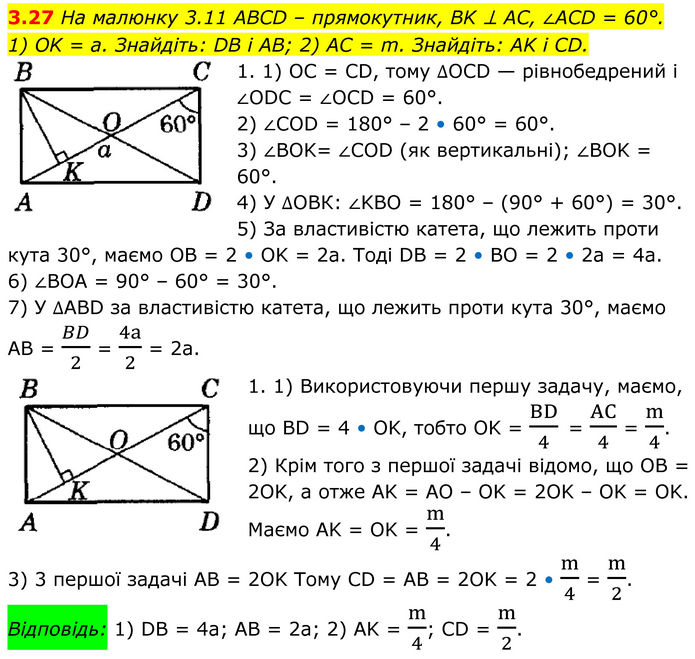 На малюнку 3.11 ABCD – прямокутник, BK ⊥ AC, ∠ACD = 60°. 1) OK = а. Знайдіть: DB і AB; 2) AC = m. Знайдіть: AK і CD. 1. 1) OC = CD, тому ∆OCD — рівнобедрений і ∠ODC = ∠OCD = 60°. 2) ∠COD = 180° – 2 • 60° = 60°. 3) ∠BOK= ∠COD (як вертикальні); ∠BOK = 60°. 4) У ∆ОВК: ∠KBO = 180° – (90° + 60°) = 30°. 5) За властивістю катета, що лежить проти кута 30°, маємо OB = 2 • OK = 2а. Тоді DB = 2 • BO = 2 • 2а = 4а. 6) ∠BOA = 90° – 60° = 30°. 7) У ∆ABD за властивістю катета, що лежить проти кута 30°, маємо АВ = BD/2 = 4a/2 = 2a. 1. 1) Використовуючи першу задачу, маємо, що BD = 4 • OK, тобто OK = BD/4 = AC/4 = m/4. 2) Крім того з першої задачі відомо, що OB = 2OK, а отже AK = AO – OK = 2OK – OK = OK. Маємо AK = OK = m/4. 3) 3 першої задачі AB = 2OK Тому CD = AB = 2OK = 2 • m/4 = m/2. Відповідь: 1) DB = 4а; AB = 2а; 2) AK = m/4; CD = m/2.