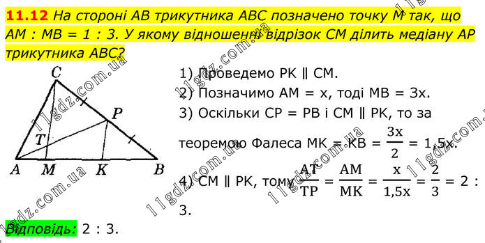 На стороні AB трикутника ABC позначено точку M так, що AM : MB = 1 : 3. У якому відношенні відрізок CM ділить медіану AP трикутника ABC? 1) Проведемо PK ∥ CM. 2) Позначимо AM = х, тоді MB = Зх. 3) Оскільки CP = PB і CM ∥ PK, то за теоремою Фалеса MK = KB = 3x/2 = 1,5x. 4) CM ∥ PK, тому AT/TP = AM/MK = x/1,5x = 2/3 = 2 : 3. Відповідь: 2 : 3.