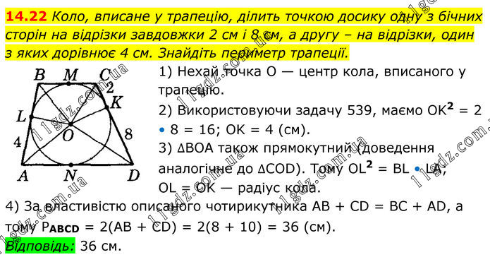 Коло, вписане у трапецію, ділить точкою досику одну з бічних сторін на відрізки завдовжки 2 см і 8 см, а другу – на відрізки, один з яких дорівнює 4 см. Знайдіть периметр трапеції. 1) Нехай точка O — центр кола, вписаного у трапецію. 2) Використовуючи задачу 539, маємо OK2 = 2 • 8 = 16; OK = 4 (см). 3) ∆BOA також прямокутний (доведення аналогічне до ∆СОD). Тому OL2 = BL • LA; OL = OK — радіус кола. 4) За властивістю описаного чотирикутника AB + CD = BC + AD, а тому PABCD = 2(AB + CD) = 2(8 + 10) = 36 (см). Відповідь: 36 см.