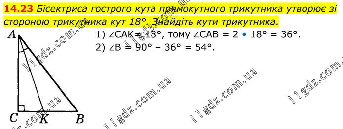 Бісектриса гострого кута прямокутного трикутника утворює зі стороною трикутника кут 18°. Знайдіть кути трикутника. 1) ∠CAK= 18°, тому ∠CAB = 2 • 18° = 36°. 2) ∠B = 90° – 36° = 54°.