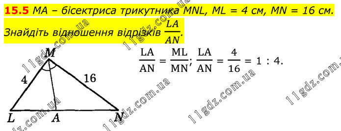 МA – бісектриса трикутника MNL, ML = 4 см, MN = 16 см. Знайдіть відношення відрізків LA/AN. LA/AN = ML/MN; LA/AN = 4/16 = 1 : 4.