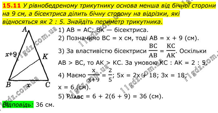У рівнобедреному трикутнику основа менша від бічної сторони на 9 см, а бісектриса ділить бічну сторону на відрізки, які відносяться як 2 : 5. Знайдіть периметр трикутника. 1) AB = AC; BK — бісектриса. 2) Позначимо BC = х см, тоді AB = х + 9 (см). 3) За властивістю бісектриси BC/AB = KC/AK. Оскільки AB > BC, то AK > KC. За умовою KC : AK = 2 : 5. 4) Маємо x/(x+9) = 2/5; 5х = 2х + 18; Зх = 18; х = 6 (см). 5) P∆ABC = 6 + 2(6 + 9) = 36 (см). Відповідь: 36 см.