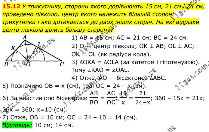 У трикутнику, сторони якого дорівнюють 15 см, 21 см і 24 см, проведено півколо, центр якого належить більшій стороні трикутника і яке дотикається до двох інших сторін. На які відрізки центр півкола ділить більшу сторону? 1) AB = 15 см; AC = 21 см; BC = 24 см. 2) O — центр півкола; OK ⊥ AB; OL ⊥ AC; OK = OL (як радіуси кола). 3) ∆OKA = ∆OLA (за катетом і гіпотенузою). Тому ∠KAO = ∠OAL. 4) Отже, AO — бісектриса ∆ABC. 5) Позначимо OB = х (см), тоді OC = 24 – х (см). 6) За властивістю бісектриси AB/BO = AC/OC; 15/x = 21/(24-x); 360 – 15х = 21х; 36х = 360; х=10 (см). 7) Отже, OB = 10 см; OC = 24 – 10 = 14 (см). Відповідь: 10 см; 14 см.