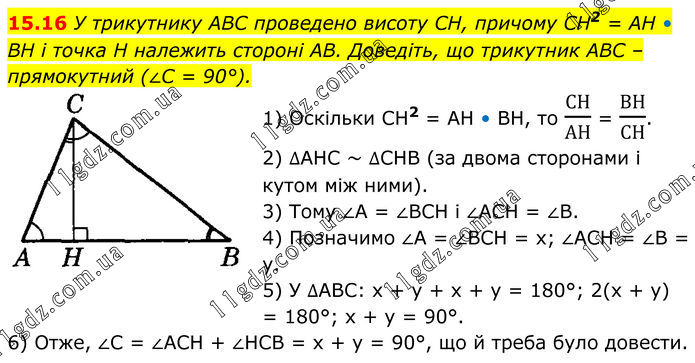 У трикутнику ABC проведено висоту CH, причому CH2 = AH • BH і точка H належить стороні AB. Доведіть, що трикутник ABC – прямокутний (∠C = 90°). 1) Оскільки CH2 = AH • BH, то СН/АН = ВН/СН. 2) ∆AHC ~ ∆CHB (за двома сторонами і кутом між ними). 3) Тому ∠A = ∠BCH і ∠ACH = ∠B. 4) Позначимо ∠A = ∠BCH = х; ∠ACH = ∠B = у. 5) У ∆ABC: х + у + х + у = 180°; 2(х + у) = 180°; х + у = 90°. 6) Отже, ∠C = ∠ACH + ∠HCB = х + у = 90°, що й треба було довести.