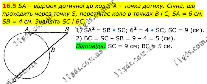SA – відрізок дотичної до кола, A – точка дотику. Січна, що проходить через точку S, перетинає коло в точках B і C, SA = 6 см, SB = 4 см. Знайдіть SC і BC. 1) SA2 = SB • SC; 62 = 4 • SC; SC = 9 (см). 2) BC = SC – SB = 9 – 4 = 5 (см). Відповідь: SC = 9 см; ВС = 5 см.
