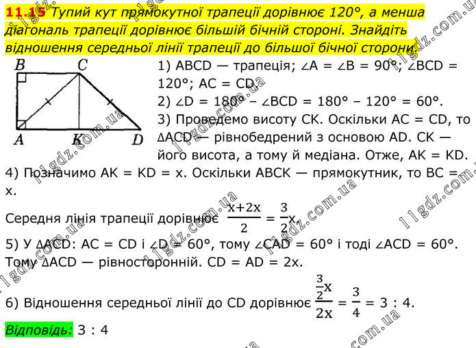 Тупий кут прямокутної трапеції дорівнює 120°, а менша діагональ трапеції дорівнює більшій бічній стороні. Знайдіть відношення середньої лінії трапеції до більшої бічної сторони. 1) ABCD — трапеція; ∠A = ∠B = 90°; ∠BCD = 120°; AC = CD. 2) ∠D = 180° – ∠BCD = 180° – 120° = 60°. 3) Проведемо висоту CK. Оскільки AC = CD, то ∆ACD — рівнобедрений з основою AD. CK — його висота, а тому й медіана. Отже, AK = KD. 4) Позначимо AK = KD = х. Оскільки ABCK — прямокутник, то BC = х. Середня лінія трапеції дорівнює (x+2x)/2 = 3/2х. 5) У ∆ACD: AC = CD і ∠D = 60°, тому ∠CAD = 60° і тоді ∠ACD = 60°. Тому ∆ACD — рівносторонній. CD = AD = 2х. 6) Відношення середньої лінії до CD дорівнює (3/2 x)/2x = 3/4 = 3 : 4. Відповідь: З : 4