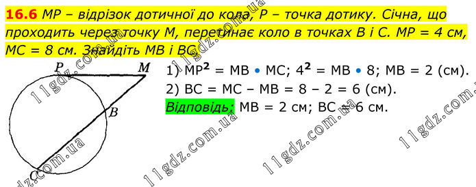 MP – відрізок дотичної до кола, P – точка дотику. Січна, що проходить через точку M, перетинає коло в точках B і C. MP = 4 см, MC = 8 см. Знайдіть MB і BC. 1) МР2 = МВ • МС; 42 = МВ • 8; МВ = 2 (см). 2) ВС = МС – МВ = 8 – 2 = 6 (см). Відповідь: МВ = 2 см; ВС = 6 см.