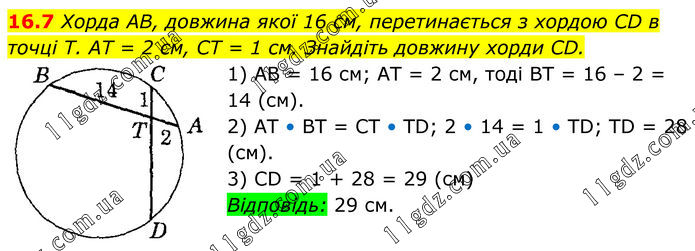 Хорда AB, довжина якої 16 см, перетинається з хордою CD в точці T. AT = 2 см, CT = 1 см. Знайдіть довжину хорди CD. 1) АВ = 16 см; АТ = 2 см, тоді ВТ = 16 – 2 = 14 (см). 2) АТ • ВТ = СТ • TD; 2 • 14 = 1 • TD; TD = 28 (см). 3) CD = 1 + 28 = 29 (см) Відповідь: 29 см.