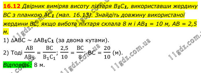Двірник виміряв висоту ліхтаря B1C1, використавши жердину BC з планкою AC1 (мал. 16.13). Знайдіть довжину використаної жердини BC, якщо вибота ліхтаря склала 8 м і AB1 = 10 м, AB = 2,5 м. 1) ∆ABC ~ ∆AB1C1 (за двома кутами). 2) Тоді АВ/(АВ_1 ) = ВС/(В_1 С_1 ); 2,5/10 = ВС/8; ВС = 20/10 (м). Відповідь: 8 м.