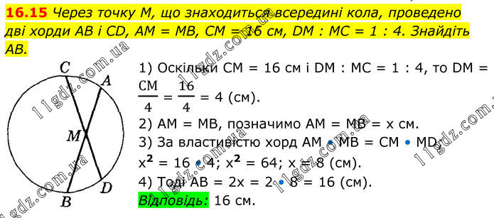Через точку M, що знаходиться всередині кола, проведено дві хорди AB і CD, AM = MB, CM = 16 см, DM : MC = 1 : 4. Знайдіть AB. 1) Оскільки CM = 16 см і DM : MC = 1 : 4, то DM = СМ/4 = 16/4 = 4 (см). 2) AM = MB, позначимо AM = MB = х см. 3) За властивістю хорд AM • MB = CM • MD; х2 = 16 • 4; х2 = 64; х = 8 (см). 4) Тоді AB = 2х = 2 • 8 = 16 (см). Відповідь: 16 см.