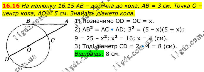 На малюнку 16.15 AB – дотична до кола, AB = 3 см. Точка O – центр кола, AO = 5 см. Знайдіть діаметр кола. 1) Позначимо OD = OC = x. 2) AB2 = AС • АD; З2 = (5 – х)(5 + х); 9 = 25 – х2; x2 = 16; х = 4 (см). 3) Тоді діаметр CD = 2 • 4 = 8 (см). Відповідь: 8 см.