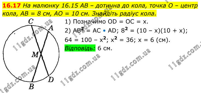 На малюнку 16.15 AB – дотична до кола, точка O – центр кола, AB = 8 см, AO = 10 см. Знайдіть радіус кола. 1) Позначимо OD = OC = х. 2) AB2 = AC • AD; 82 = (10 – х)(10 + х); 64 = 100 – х2; x2 = 36; х = 6 (см). Відповідь: 6 см.