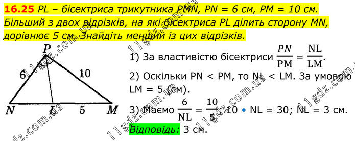 PL – бісектриса трикутника PMN, PN = 6 см, PM = 10 см. Більший з двох відрізків, на які бісектриса PL ділить сторону MN, дорівнює 5 см. Знайдіть менший із цих відрізків. 1) За властивістю бісектриси PN/PM = NL/LM. 2) Оскільки PN < PM, то NL < LM. За умовою LM = 5 (см). 3) Маємо 6/NL = 10/5; 10 • NL = 30; NL = 3 см. Відповідь: З см.
