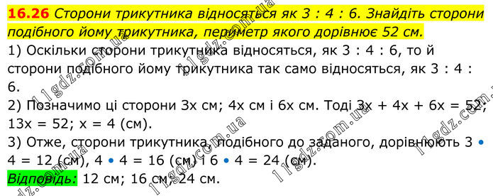Сторони трикутника відносяться як 3 : 4 : 6. Знайдіть сторони подібного йому трикутника, периметр якого дорівнює 52 см. 1) Оскільки сторони трикутника відносяться, як 3 : 4 : 6, то й сторони подібного йому трикутника так само відносяться, як 3 : 4 : 6. 2) Позначимо ці сторони Зx см; 4x см і 6x см. Тоді Зx + 4х + 6x = 52; 13х = 52; х = 4 (см). 3) Отже, сторони трикутника, подібного до заданого, дорівнюють 3 • 4 = 12 (см), 4 • 4 = 16 (см) і 6 • 4 = 24 (см). Відповідь: 12 см; 16 см; 24 см.