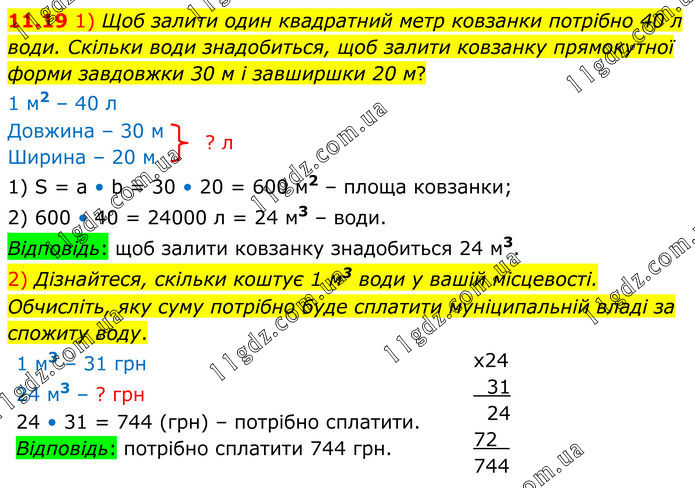 11.19 1) Щоб залити один квадратний метр ковзанки потрібно 40 л води. Скільки води знадобиться, щоб залити ковзанку прямокутної форми завдовжки 30 м і завширшки 20 м? 1 м2 – 40 л Довжина – 30 м Ширина – 20 м 1) S = a • b = 30 • 20 = 600 м2 – площа ковзанки; 2) 600 • 40 = 24000 л = 24 м3 – води. Відповідь: щоб залити ковзанку знадобиться 24 м3. 2) Дізнайтеся, скільки коштує 1 м3 води у вашій місцевості. Обчисліть, яку суму потрібно буде сплатити муніципальній владі за спожиту воду. 1 м3 – 31 грн 24 м3 – ? грн 24 • 31 = 744 (грн) – потрібно сплатити. Відповідь: потрібно сплатити 744 грн. х24 31 24 72_ 744
