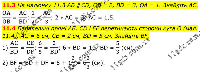 11.3 На малюнку 11.3 AB ∥ CD, OB = 2, BD = 3, OA = 1. Знайдіть AC. OA/OB = AC/BD; 1/2 = AC/3; 2 • AC = 3; AC = 1,5. 11.4 Паралельні прямі AB, CD і EF перетинають сторони куга O (мал. 11.4). AC = 6 см, CE = 2 см, BD = 5 см. Знайдіть BF. 1) AC/BD = CE/DF; 6/5 = 2/BD; 6 • BD = 10; BD = 5/3 (см). 2) BF = BD + DF = 5 + 12/3 = 62/3 (см).