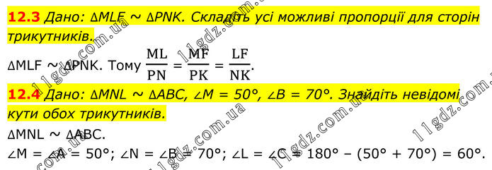 12.3 Дано: ∆MLF ~ ∆PNK. Складіть усі можливі пропорції для сторін трикутників. ∆MLF ~ ∆PNK. Тому ML/PN = MF/PK = LF/NK. 12.4 Дано: ∆MNL ~ ∆АВС, ∠M = 50°, ∠B = 70°. Знайдіть невідомі кути обох трикутників. ∆MNL ~ ∆АВС. ∠M = ∠A = 50°; ∠N = ∠B = 70°; ∠L = ∠C = 180° – (50° + 70°) = 60°.