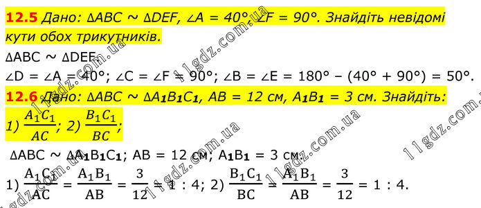 12.5 Дано: ∆ABC ~ ∆DEF, ∠A = 40°, ∠F = 90°. Знайдіть невідомі кути обох трикутників. ∆ABC ~ ∆DEF. ∠D = ∠A = 40°; ∠C = ∠F = 90°; ∠B = ∠E = 180° – (40° + 90°) = 50°. 12.6 Дано: ∆ABC ~ ∆A1B1C1, AB = 12 см, A1B1 = 3 см. Знайдіть: 1) (A_1 C_1)/AC; 2) (B_1 C_1)/BC; ∆ABC ~ ∆A1B1C1; AB = 12 см; A1B1 = 3 см. 1) (A_1 C_1)/AC = (A_1 B_1)/AB = 3/12 = 1 : 4; 2) (B_1 C_1)/BC = (A_1 B_1)/AB = 3/12 = 1 : 4.