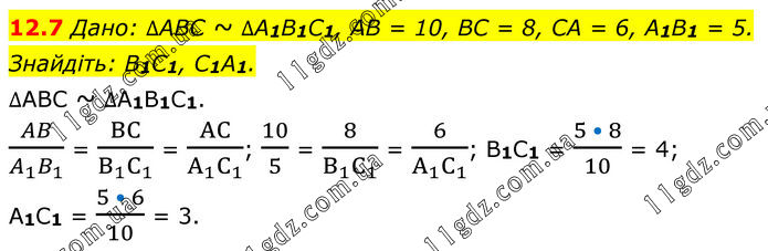12.7 Дано: ∆ABC ~ ∆A1B1C1, AB = 10, BC = 8, CA = 6, A1B1 = 5. Знайдіть: B1C1, C1A1. ∆ABC ~ ∆A1B1C1. AB/(A_1 B_1 ) = BC/(B_1 C_1 ) = AC/(A_1 C_1 ); 10/5 = 8/(B_1 C_1 ) = 6/(A_1 C_1 ); B1C1 = (5 • 8)/10 = 4; A1C1 = (5 • 6)/10 = 3.