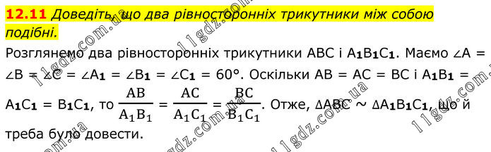 Доведіть, що два рівносторонніх трикутники між собою подібні. Розглянемо два рівносторонніх трикутники ABC і A1B1C1. Маємо ∠A = ∠B = ∠C = ∠A1 = ∠B1 = ∠C1 = 60°. Оскільки AB = AC = BC і A1B1 = A1C1 = B1C1, то AB/(A_1 B_1 ) = AC/(A_1 C_1 ) = BC/(B_1 C_1 ). Отже, ∆ABC ~ ∆A1B1C1, що й треба було довести.
