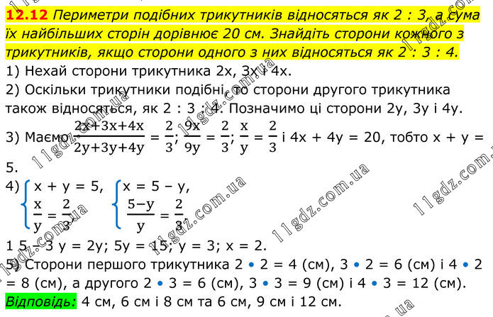 Периметри подібних трикутників відносяться як 2 : 3, а сума їх найбільших сторін дорівнює 20 см. Знайдіть сторони кожного з трикутників, якщо сторони одного з них відносяться як 2 : 3 : 4. 1) Нехай сторони трикутника 2х, Зх і 4х. 2) Оскільки трикутники подібні, то сторони другого трикутника також відносяться, як 2 : 3 : 4. Позначимо ці сторони 2у, 3y і 4у. 3) Маємо (2x+3x+4x)/(2y+3y+4y) = 2/3; 9x/9y = 2/3; x/y = 2/3 і 4x + 4y = 20, тобто х + у = 5. 4) x + y = 5, x = 5 – y, x/y = 2/3, (5-y)/y = 2/3. 15 – 3у = 2у; 5у = 15; у = 3; х = 2. 5) Сторони першого трикутника 2 • 2 = 4 (см), 3 • 2 = 6 (см) і 4 • 2 = 8 (см), а другого 2 • 3 = 6 (см), 3 • 3 = 9 (см) і 4 • 3 = 12 (см). Відповідь: 4 см, 6 см і 8 см та 6 см, 9 см і 12 см.
