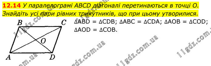 У паралелограмі ABCD діагоналі перетинаються в точці O. Знайдіть усі пари рівних трикутників, що при цьому утворилися. ∆ABD = ∆CDB; ∆ABC = ∆CDA; ∆AOB = ∆COD; ∆AOD = ∆СОВ.
