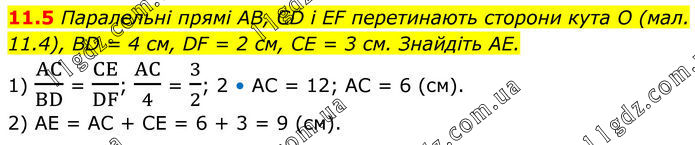 11.5 Паралельні прямі AB, CD і EF перетинають сторони кута O (мал. 11.4), BD = 4 см, DF = 2 см, CЕ = 3 см. Знайдіть AE. 1) AC/BD = CE/DF; AC/4 = 3/2; 2 • AC = 12; AC = 6 (см). 2) AE = AC + CE = 6 + 3 = 9 (см).