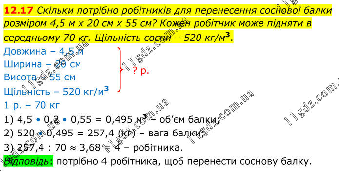 Скільки потрібно робітників для перенесення соснової балки розміром 4,5 м х 20 см х 55 см? Кожен робітник може підняти в середньому 70 кг. Щільність сосни – 520 кг/м3. 1) 4,5 • 0,2 • 0,55 = 0,495 м3 – об’єм балки; 2) 520 • 0,495 = 257,4 (кг) – вага балки; 3) 257,4 : 70 ≈ 3,68 = 4 – робітника. Відповідь: потрібно 4 робітника, щоб перенести соснову балку.