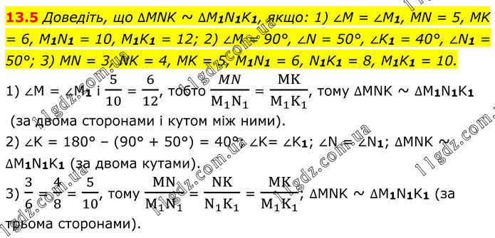 Доведіть, що ∆MNK ~ ∆M1N1K1, якщо: 1) ∠M = ∠M1, MN = 5, MK = 6, M1N1 = 10, M1K1 = 12; 2) ∠M = 90°, ∠N = 50°, ∠K1 = 40°, ∠N1 = 50°; 3) MN = 3, NK = 4, MK = 5, M1N1 = 6, N1K1 = 8, M1K1 = 10. 1) ∠M = ∠M1 і 5/10 = 6/12, тобто MN/(M_1 N_1 ) = MK/(M_1 K_1 ), тому ∆MNK ~ ∆M1N1K1 (за двома сторонами і кутом між ними). 2) ∠K = 180° – (90° + 50°) = 40°; ∠K= ∠K1; ∠N = ∠N1; ∆MNK ~ ∆M1N1K1 (за двома кутами). 3) 3/6 = 4/8 = 5/10, тому MN/(M_1 N_1 ) = NK/(N_1 K_1 ) = MK/(M_1 K_1 ); ∆MNK ~ ∆M1N1K1 (за трьома сторонами).