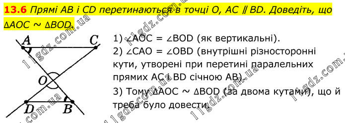 Прямі AB і CD перетинаються в точці O, AC ∥ BD. Доведіть, що ∆AOC ~ ∆BOD. 1) ∠AOC = ∠BOD (як вертикальні). 2) ∠CAO = ∠OBD (внутрішні різносторонні кути, утворені при перетині паралельних прямих AC і BD січною AB). 3) Тому ∆AOC ~ ∆BOD (за двома кутами), що й треба було довести.