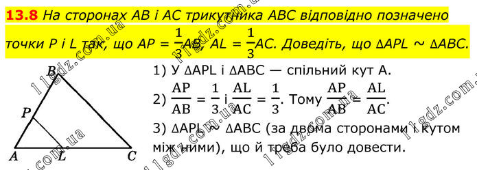 На сторонах AB і AC трикутника ABC відповідно позначено точки P і L так, що AP = 1/3AB, AL = 1/3AC. Доведіть, що ∆APL ~ ∆ABC. 1) У ∆APL і ∆ABC — спільний кут А. 2) AP/AB = 1/3 і AL/AC = 1/3. Тому AP/AB = AL/AC. 3) ∆APL ~ ∆ABC (за двома сторонами і кутом між ними), що й треба було довести.