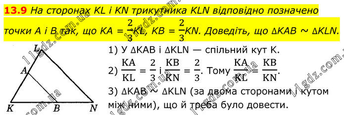 На сторонах KL і KN трикутника KLN відповідно позначено точки A і B так, що KA = 2/3KL, KB = 2/3KN. Доведіть, що ∆KAB ~ ∆KLN. 1) У ∆KAB і ∆KLN — спільний кут K. 2) KA/KL = 2/3 і KB/KN = 2/3. Тому KA/KL = KB/KN. 3) ∆KAB ~ ∆KLN (за двома сторонами і кутом між ними), що й треба було довести.