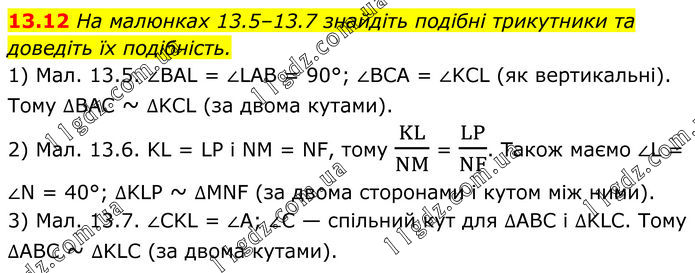 На малюнках 13.5–13.7 знайдіть подібні трикутники та доведіть їх подібність. 1) Мал. 13.5. ∠BAL = ∠LAB = 90°; ∠BCA = ∠KCL (як вертикальні). Тому ∆BAC ~ ∆KCL (за двома кутами). 2) Мал. 13.6. KL = LP і NM = NF, тому KL/NM = LP/NF. Також маємо ∠L = ∠N = 40°; ∆KLP ~ ∆MNF (за двома сторонами і кутом між ними). 3) Мал. 13.7. ∠CKL = ∠A; ∠C — спільний кут для ∆ABC і ∆KLC. Тому ∆ABC ~ ∆KLC (за двома кутами).