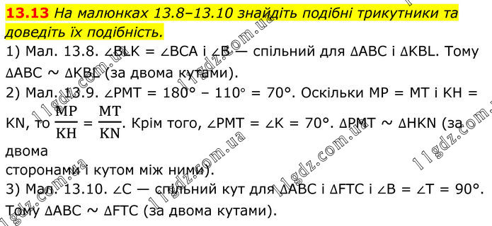 На малюнках 13.8–13.10 знайдіть подібні трикутники та доведіть їх подібність. 1) Мал. 13.8. ∠BLK = ∠BCA і ∠B — спільний для ∆ABC і ∆KBL. Тому ∆ABC ~ ∆KBL (за двома кутами). 2) Мал. 13.9. ∠PMT = 180° – 110° = 70°. Оскільки MP = MT i KH = KN, то MP/KH = MT/KN. Крім того, ∠PMT = ∠K = 70°. ∆PMT ~ ∆HKN (за двома сторонами і кутом між ними). 3) Мал. 13.10. ∠C — спільний кут для ∆ABC і ∆FTC і ∠B = ∠T = 90°. Тому ∆ABC ~ ∆FTC (за двома кутами).